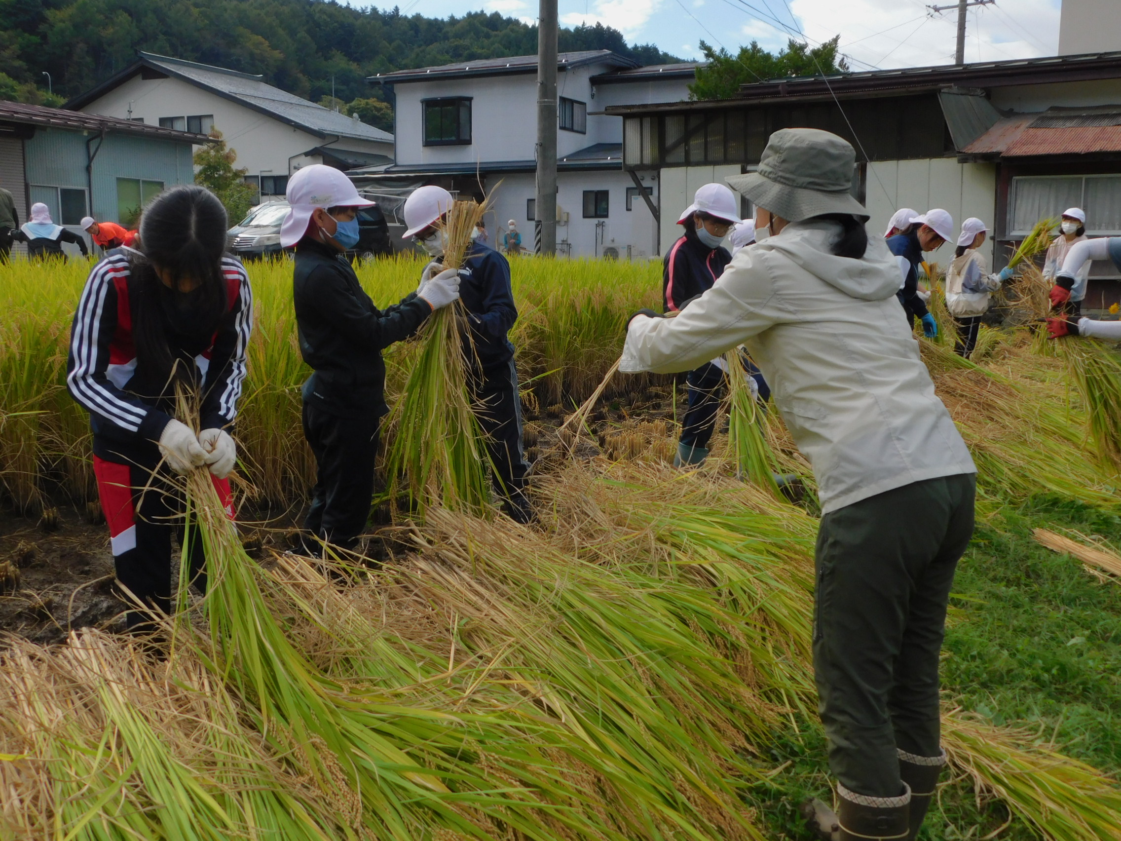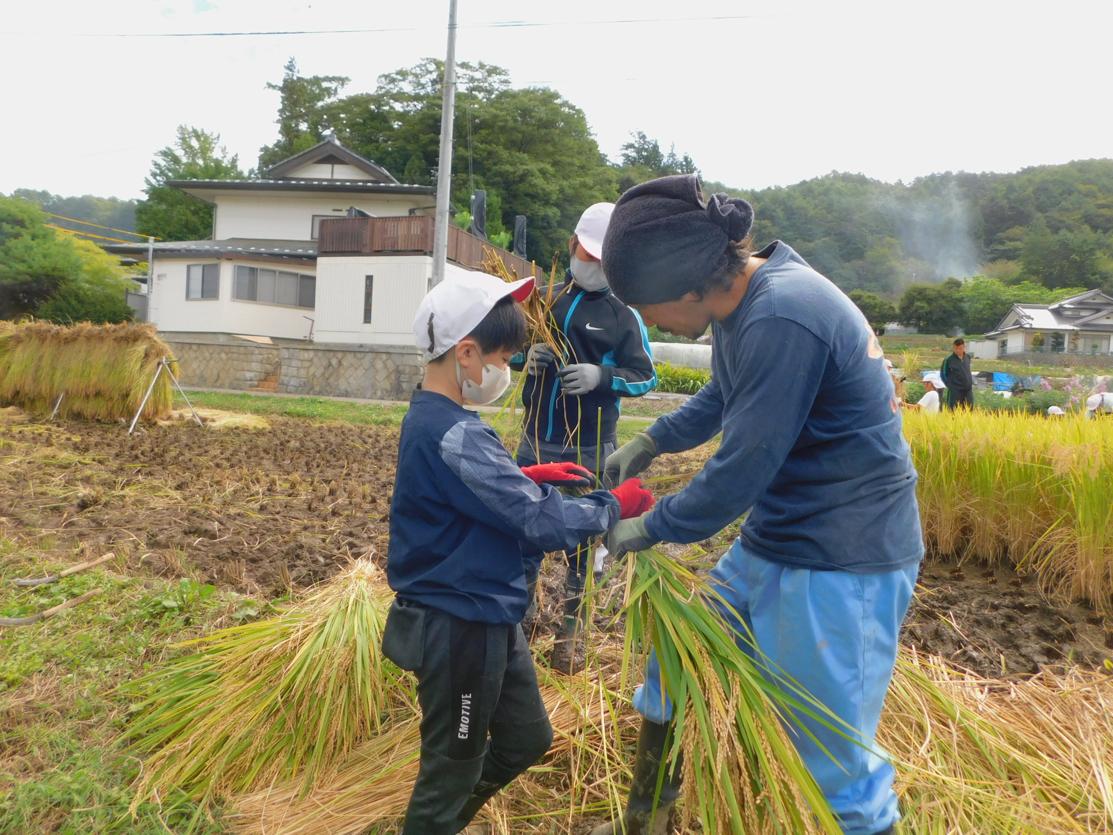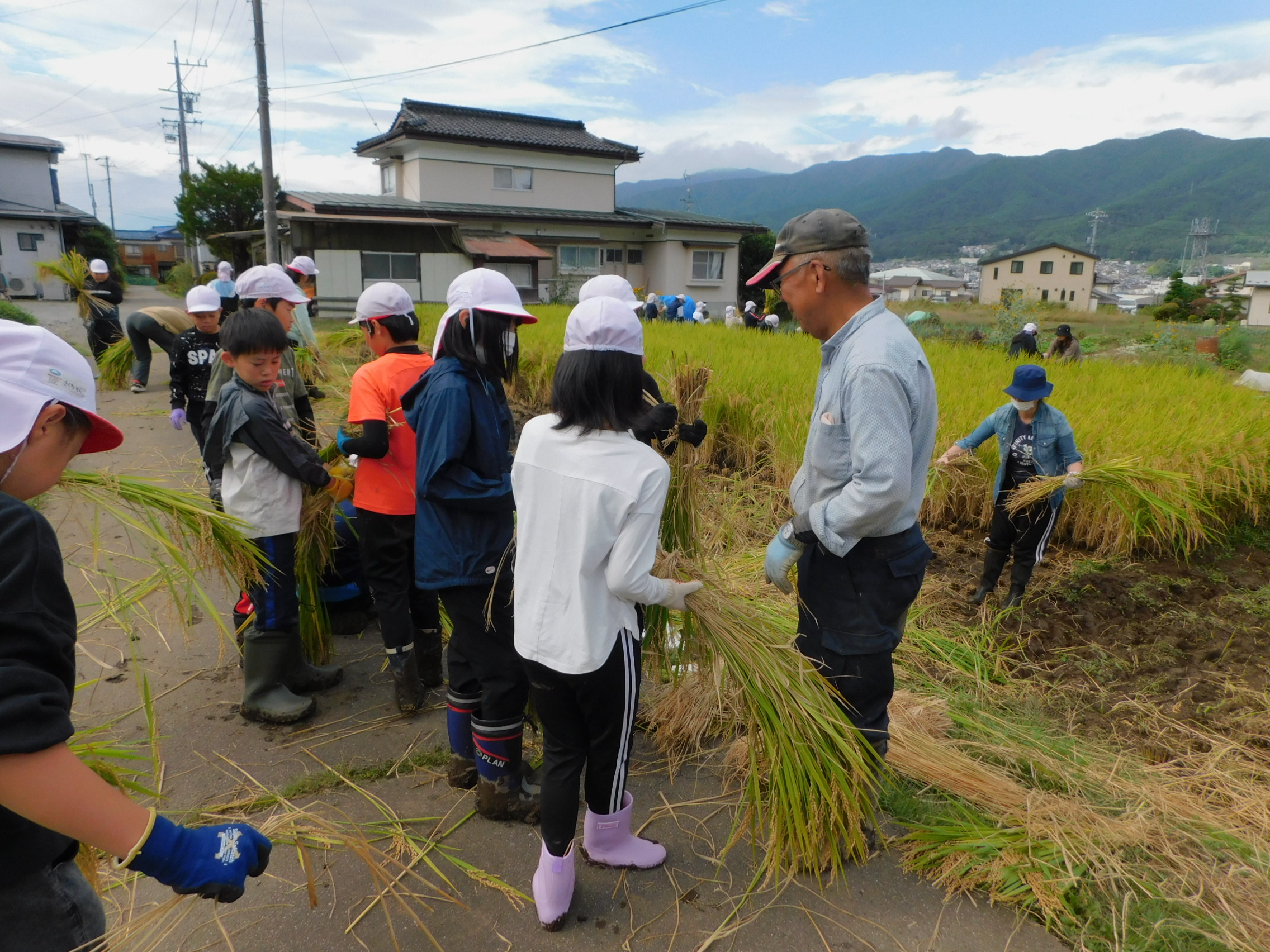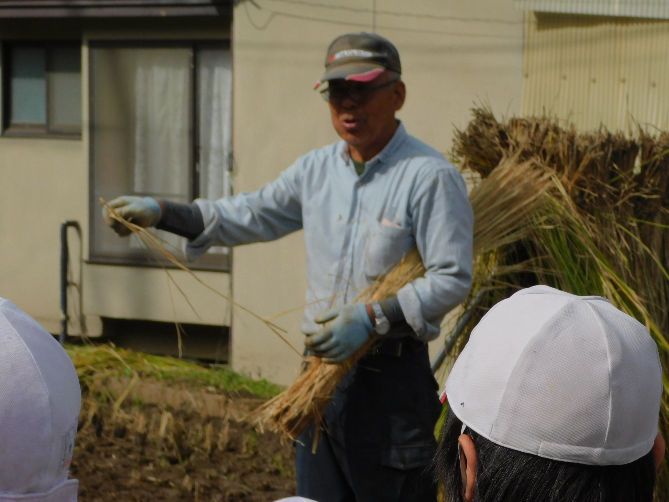 学校評議員である中村利雄さんのご指導のもと、刈った稲をわらで縛る方法を教えていただき、子どもたちは悪戦苦闘しながらも一生懸命取り組んでいました。